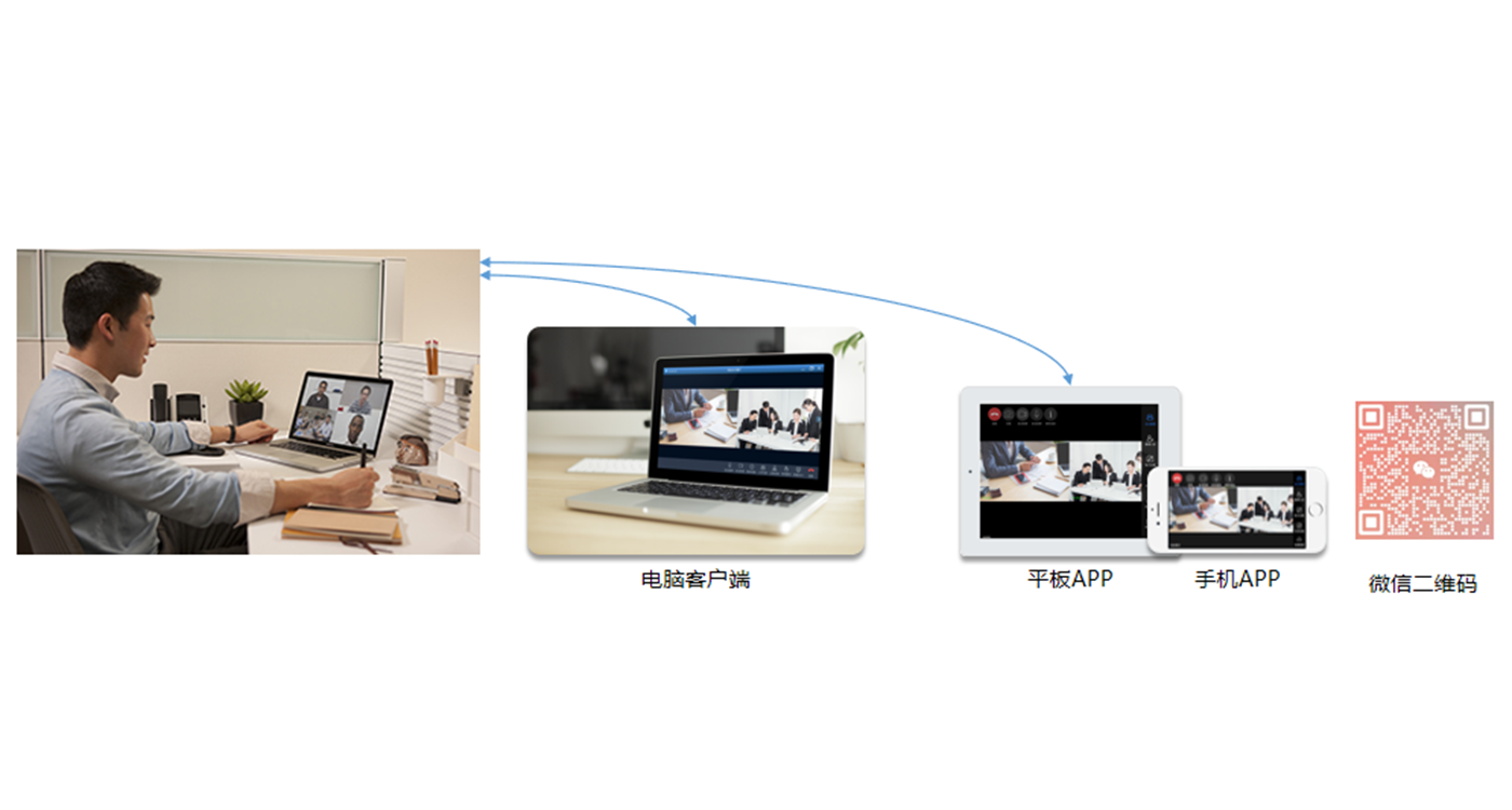 使用方便的桌面办公来适应快节奏的工作,使客户增加与金融各部门的交往时间。可通过个人电脑安装客户端桌面会议终端或者安卓手机、平板以及苹果手机和平板安装APP移动会议终端,支持双流视频会议,可发送、接收PPT、PDF等文档视频信号,满足便携式的视频会议业务需求。