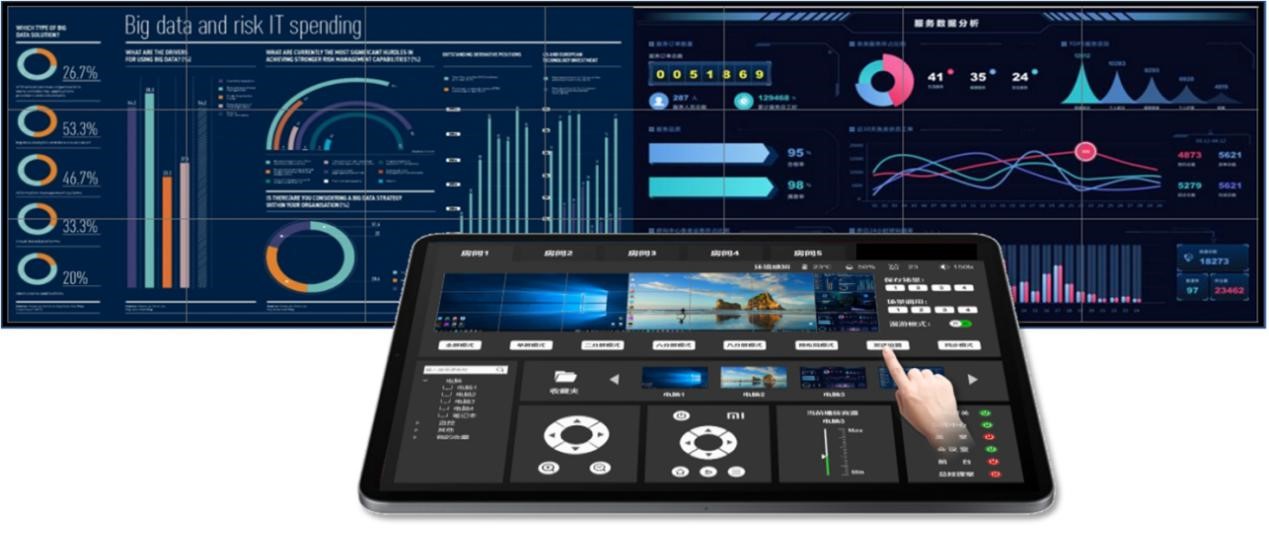 分布式可视化管控系统支持手持平板或控制电脑可视化操作,包括对信号的上屏,删除大屏上面的显示画面、各种大屏显示方案的设置保存调用。支持对信号源统一管理和预览。支持摄像头等设备的控制操作界面定制。单个节点支持一路音频输入,一路音频输出,以及支持对音量的调节功能,可手动拖拉音量滚动条调节输出音量大小。